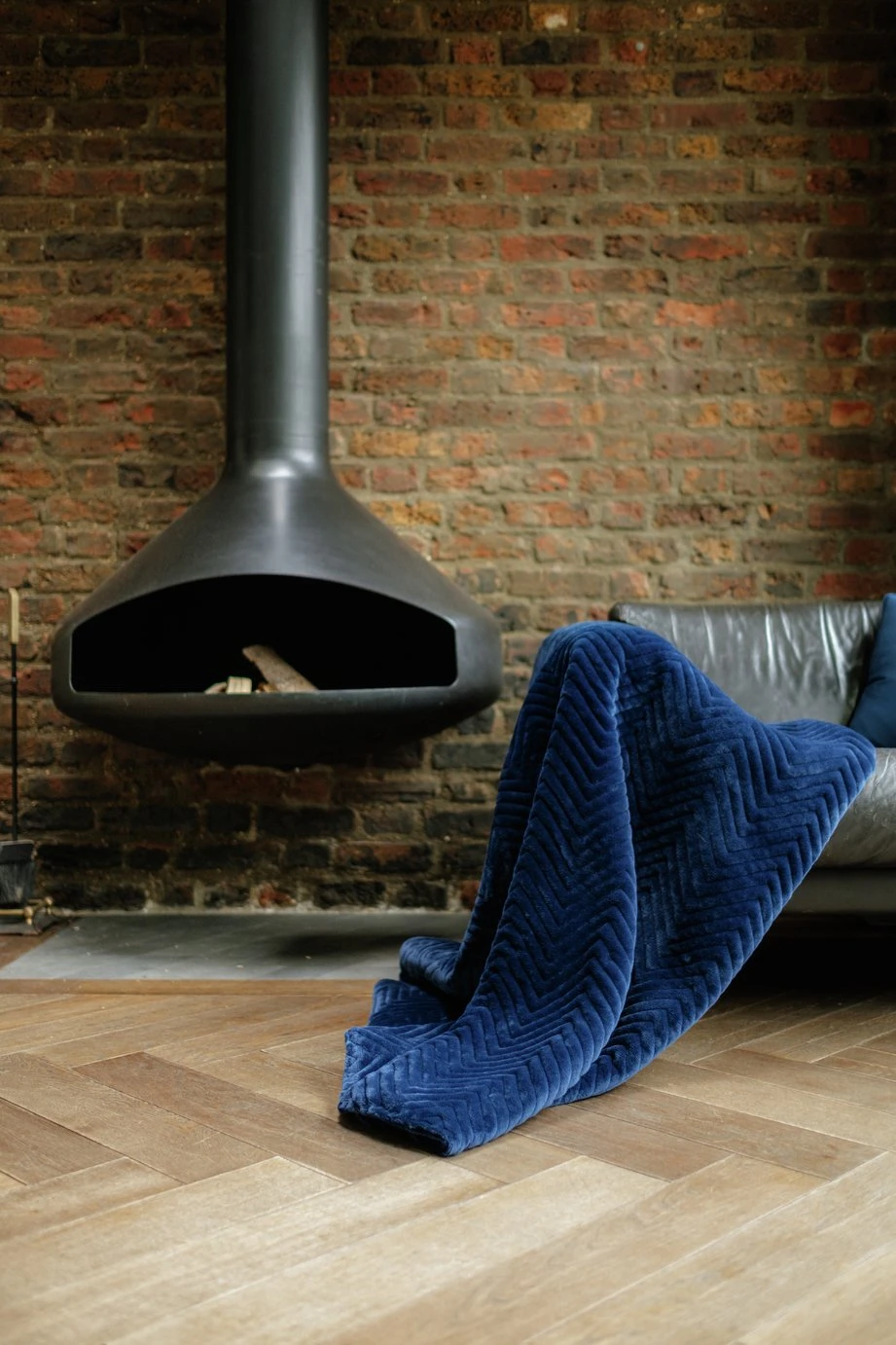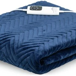 Luxurious quilted velvet warming throw in Navy Blue, featuring a contemporary herringbone pattern perfect for solo snuggling or shared cocooning. And when you're not requiring the warmth and wellbeing benefits, it cleverly doubles up as a lavish living room accessory. 5 minute fast heat up, 6 temperature settings, auto shut off timer. It's machine washable and tumble dryer safe; simply detach the digital control. Comes with a reusable storage bag and 2 year guarantee. Energy saving, costing from only 1p to run.