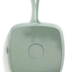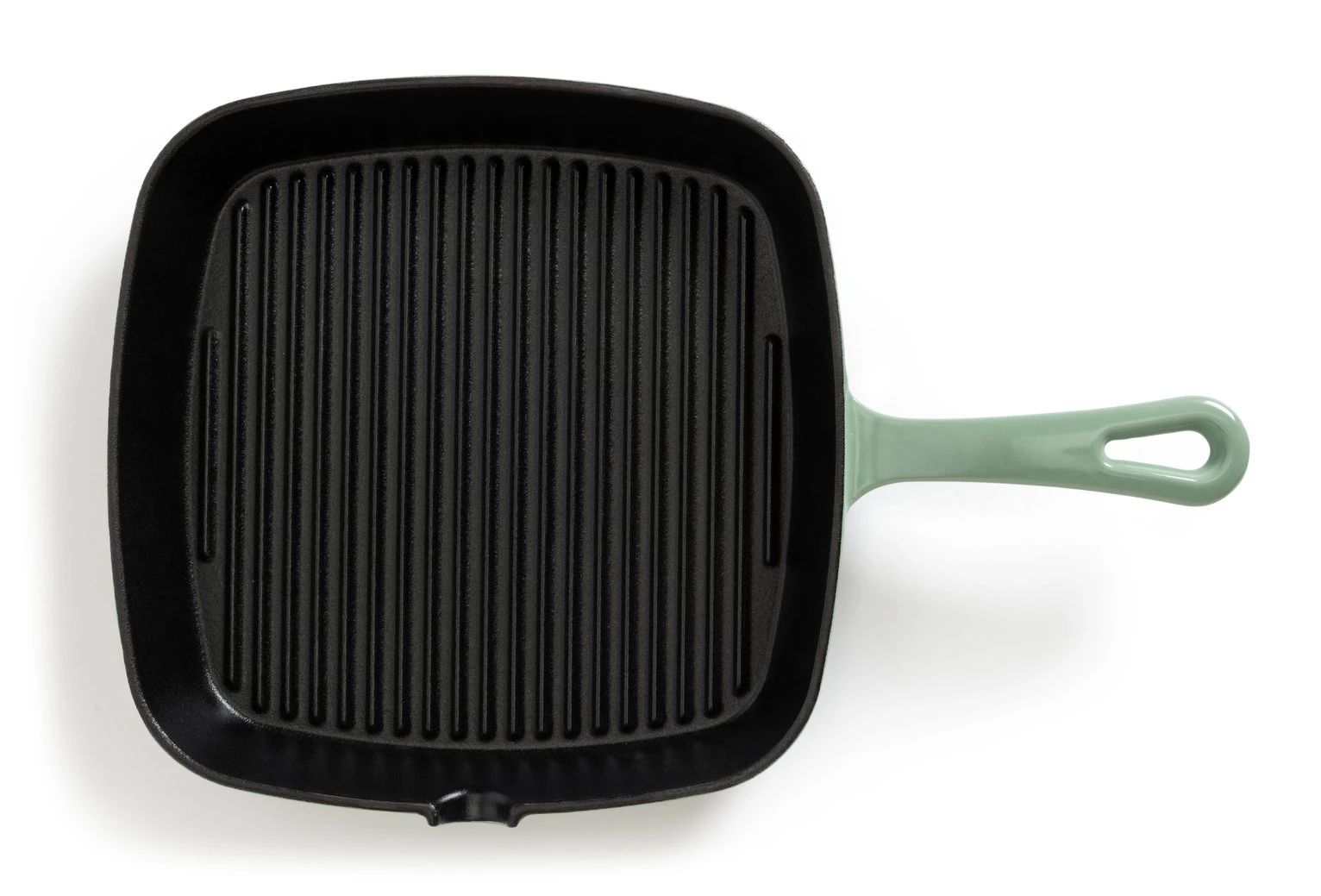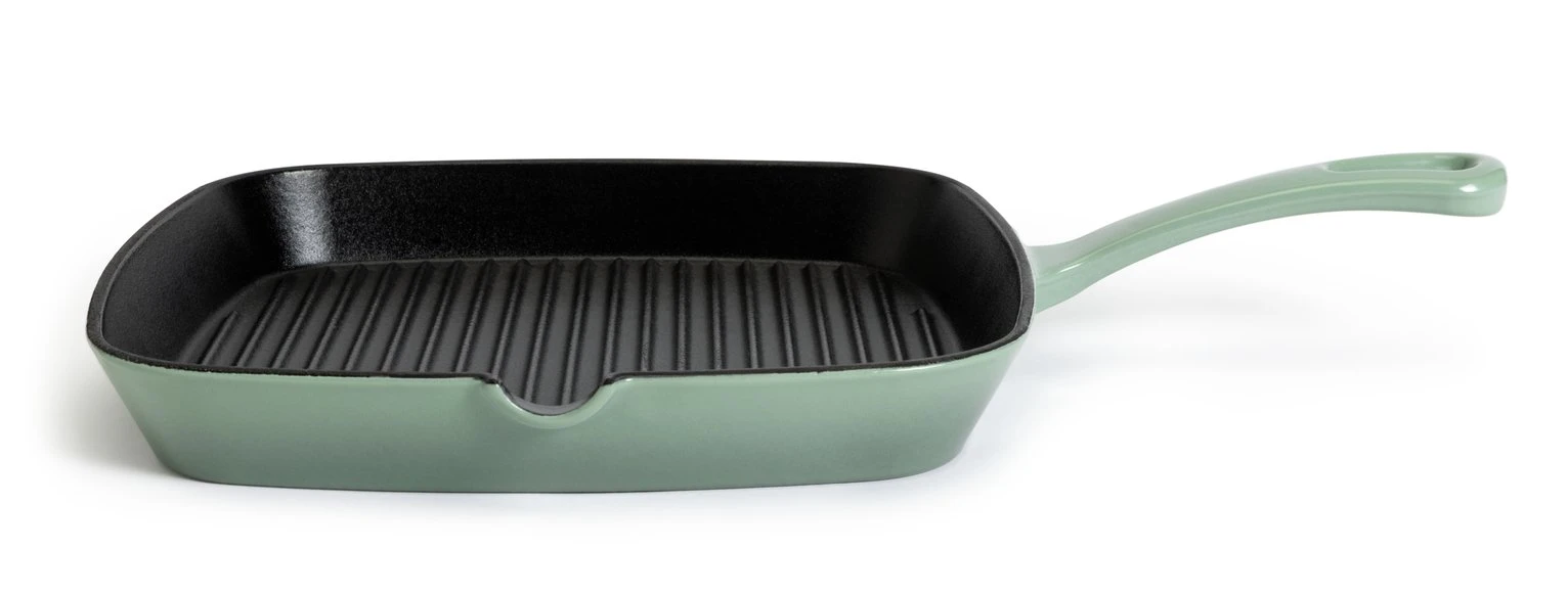 Cook up some classics. Our sage green cast iron griddle pan's perfect for producing juicy burgers, tasty charred veg and sizzling sausages. With even heat distribution and a spout to pour off fat from the ridged collection channels, this is a healthier way to prepare a meal.