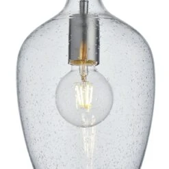 Bubbles and sparkles. This chrome and glass pendant features a clear glass globe injected with delightfully random bubbles. Turn the light on and enjoy the sprinkle of light patterns on your ceiling and walls. Set on a contemporary chrome fixed rod, the glass bottle pedant would create a stir in your kitchen or hang three in a row over your dining table for a stunning effect.