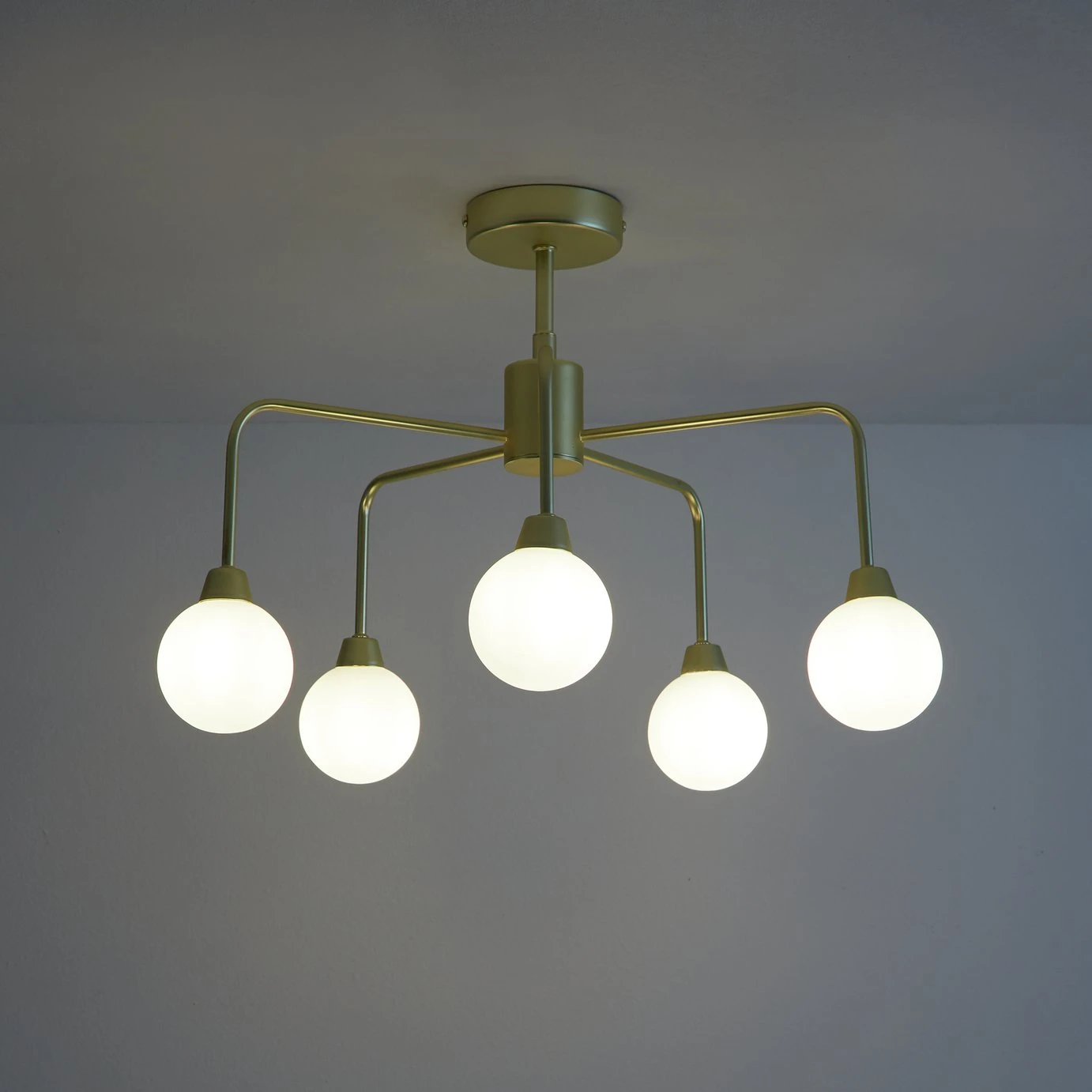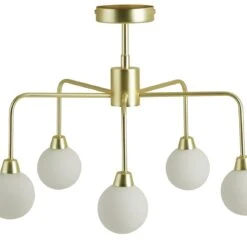 Lighting that's in a class of its own. Our Boyd glass and brushed brass ceiling light is a modern-day chandelier. Hang it in your hallway or living room to meet visitors in style. The structured 5-arm brass frame supports lovely opal glass balls which emit a soft even glow. Great-looking switched on or off, don't you agree?