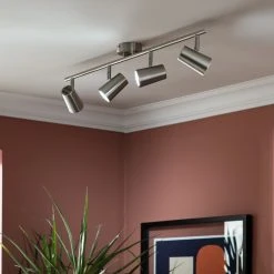 Directional lighting just got smooth. With a contemporary brushed chrome finish, this 4 light spotlight bar has a clean crisp style with a smart modern finish. Gently tapered lights are suspended from contrasting chrome arms, while the geometric air vents at the back add a hint of retro design.