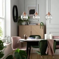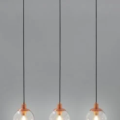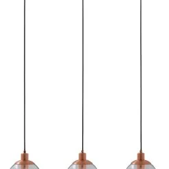 Go for a golden glow. Our triple pendant light in copper and glass adds a touch of class to your kitchen or dining room. The 3 handsomely rounded bowls are great for showing off Edison bulbs. Ideal for lighting up an island or breakfast bar. Hang it over your table for a touch of show-home glamour. Simple but striking.