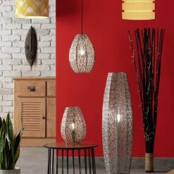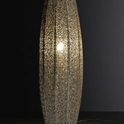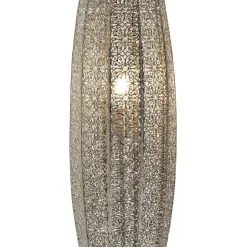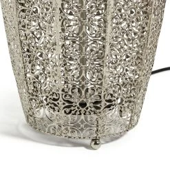Discover lighting inspired by global travels for a warm and inviting home with our Global lighting collection. It's the exquisite detailing of this metallic Global fretwork floor lamp that really sets it apart from the rest. With its decorative cut-out pattern, delicately forged with a polished nickel finish, it glimmers and gleams when it's off, and it calms and relaxes when it's on. Casting patterns of light around the room, it's a real showstopper. Matching table lamp and ceiling shade available to complete the look.