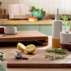 Ready to slice and dice? Make quick work of meal prep with our chopping board. Made from high quality acacia wood with a rich looking grain. One smart design. When finished simply wipe clean and slide together. This cutting board stays where it's put, thanks to the non-slip feet. Neat.