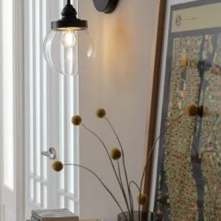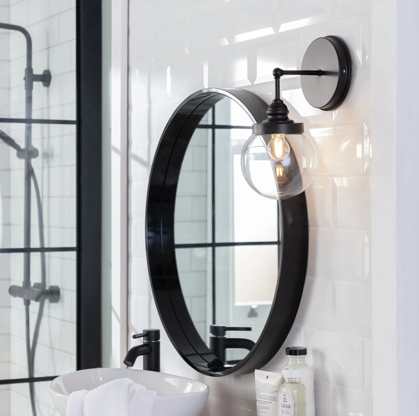 Switch on to some super stark style wall light. A modern take on a classic design. The clear glass globe suspended from the black metal frame has a minimalist, industrial feel. Bathroom friendly too. So, pop one either side of a wall mirror, stand back, and admire.