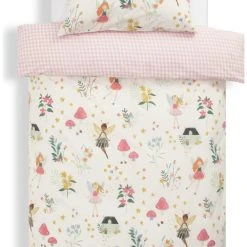 An enchanting toddler's bed set. Happy fairies dance around the garden to create a playful mood. And when the lights go down, the magic begins. See the fairy glow appear. Luminous ink lights up the fairy toadstools, stars, houses and fairy wings.