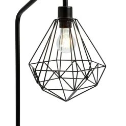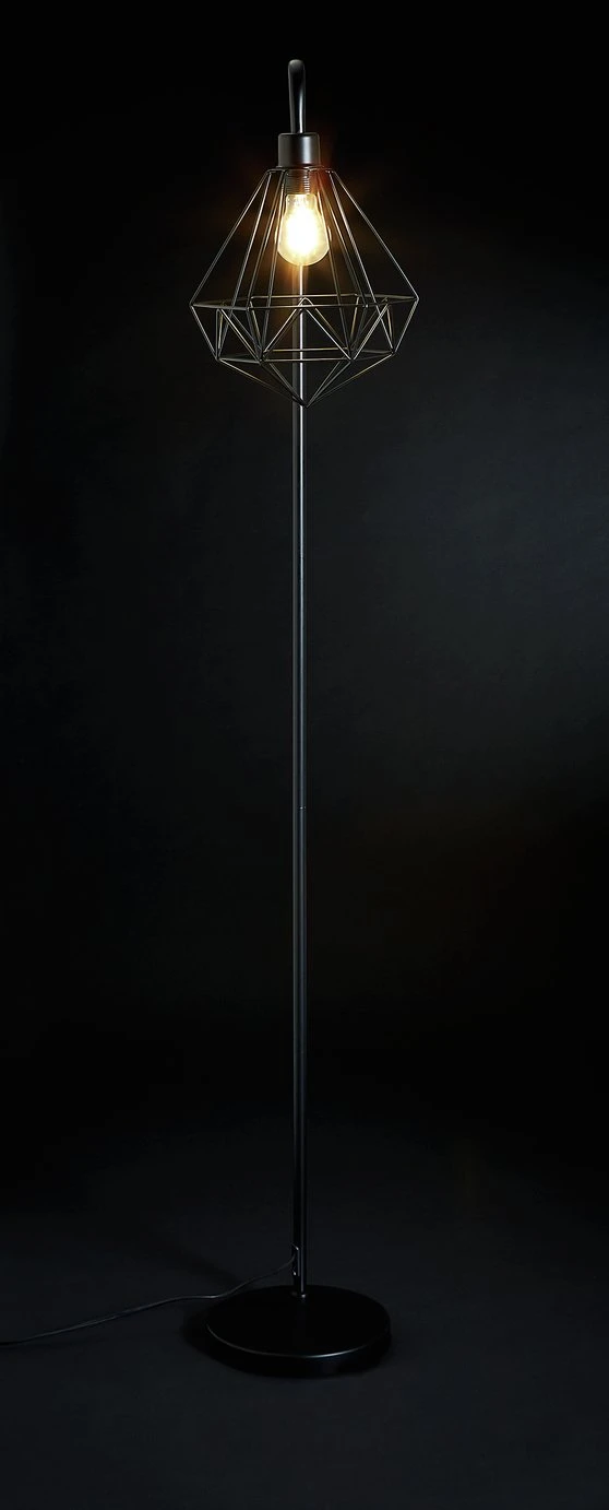 What a smart upstanding floor lamp with a geometric cage for a shade. Industrial vibe and architectural looks all in one. Looks good on or off. A modern classic with a painted, matt black over sofa stand. Stunning. Simple. Versatile for living room, bedroom or even study.