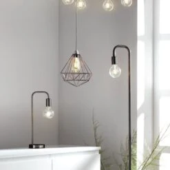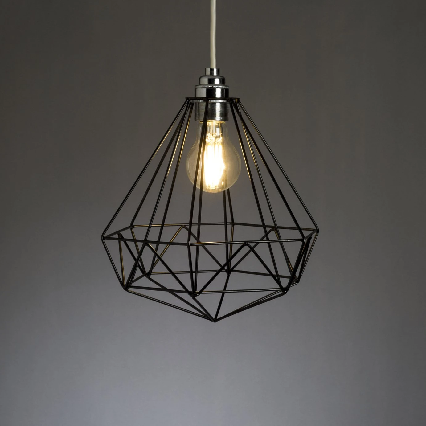 Geometric design makes a bold entrance with this strking pendant shade. With its black steel finish it celebrates the brilliance of feature bulbs, exposing the bulb for a clean understated look. Designed to cast bright light across your room, the Kanso wire pendant shade is a must for any modern on-trend space. See the rest of the Kanso collection to complete the look.