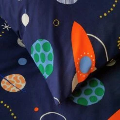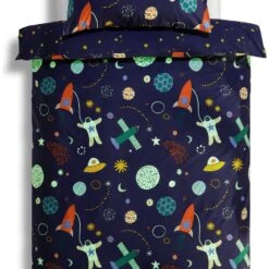 Who's ready for drift off? Our space-tastic duvet set covered in colorful cosmic characters is so cute. Your youngster will love watching planets, satellites and rockets glow in the dark when it's time for lights out. It's soft and snuggly for a cosy night's sleep. Buttons make for quick and easy sheet changes, too. How about a bedtime story?