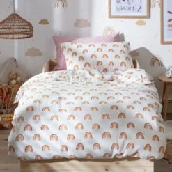 This smart bed set comes with a matching pillowcase. Made in durable cotton percale, this rainbow bedding is soft and light to the touch.
