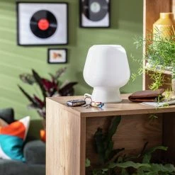 Light up the room with Lucetta. This dainty little table lamp offers up plenty of retro flare. Made from white glass with a curvaceous silhouette, it's the perfect addition to your reading book or bedside. Simple yet stylish, it's 19.6cm tall with a width of 17cm and requires 1 small Edison screw bulb. With an easy-to-use mainline switch, you can sit back with your favourite page-turner and bask in Lucetta's soft warm glow. This versatile lamp is always a bright idea.
