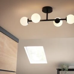 Our glass orb lighting feature is as at home in the living area as it is in the bathroom. Bringing a twist of modernity to a classic style. A bold matte black bar supports four opaque glass globes. And as it's flush-fitting, you don't need a high ceiling to create an impact.