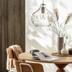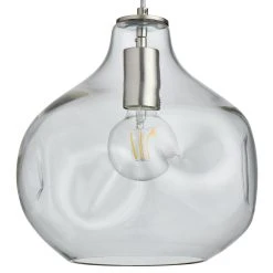 An elegantly simple design with a contemporary twist. The Ori dimple glass pendant light is a clean, modern addition to any dining room, kitchen, or hallway. Finished in nickel with a clear, mouth blown glass shade, it features a dimpled silhouette that adds a unique quality to the design. Suspended on a soft, fabric covered cord, it's ideal for adding ambience to a room without dominating the space. Looks fantastic in any style of home setting.