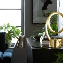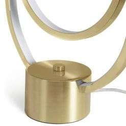Make a brilliant statement. This showstopping table lamp looks stunning turned on or off. Gleaming brushed brass curves reflect space and light to create a truly polished look. And the smooth integrated LED bulbs radiate circles of light to illuminate the room. Dynamic and different, just flick the switch for a gorgeous, glamorous glow.