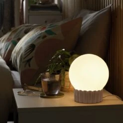 A pearl of a lamp. Light up our globe table lamp and enjoy its soft warm glow. With a ribbed peach resin base, it has a delicate aura that sets the tone. Even switched off, it makes a fab decor piece.