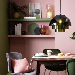 A shining style statements. Our large, 3-tiered tinted glass lampshade is opulent in olive green. Charmingly retro, this cool and curvy pendant light brings an extravagant feel to your lounge or bedroom. Each circular segment filters light beautifully, giving off a warm, cosy glow. We've included a black ceiling rose, cable and disc to tie it all together nicely. Ravishing, well-rounded and radiant.
