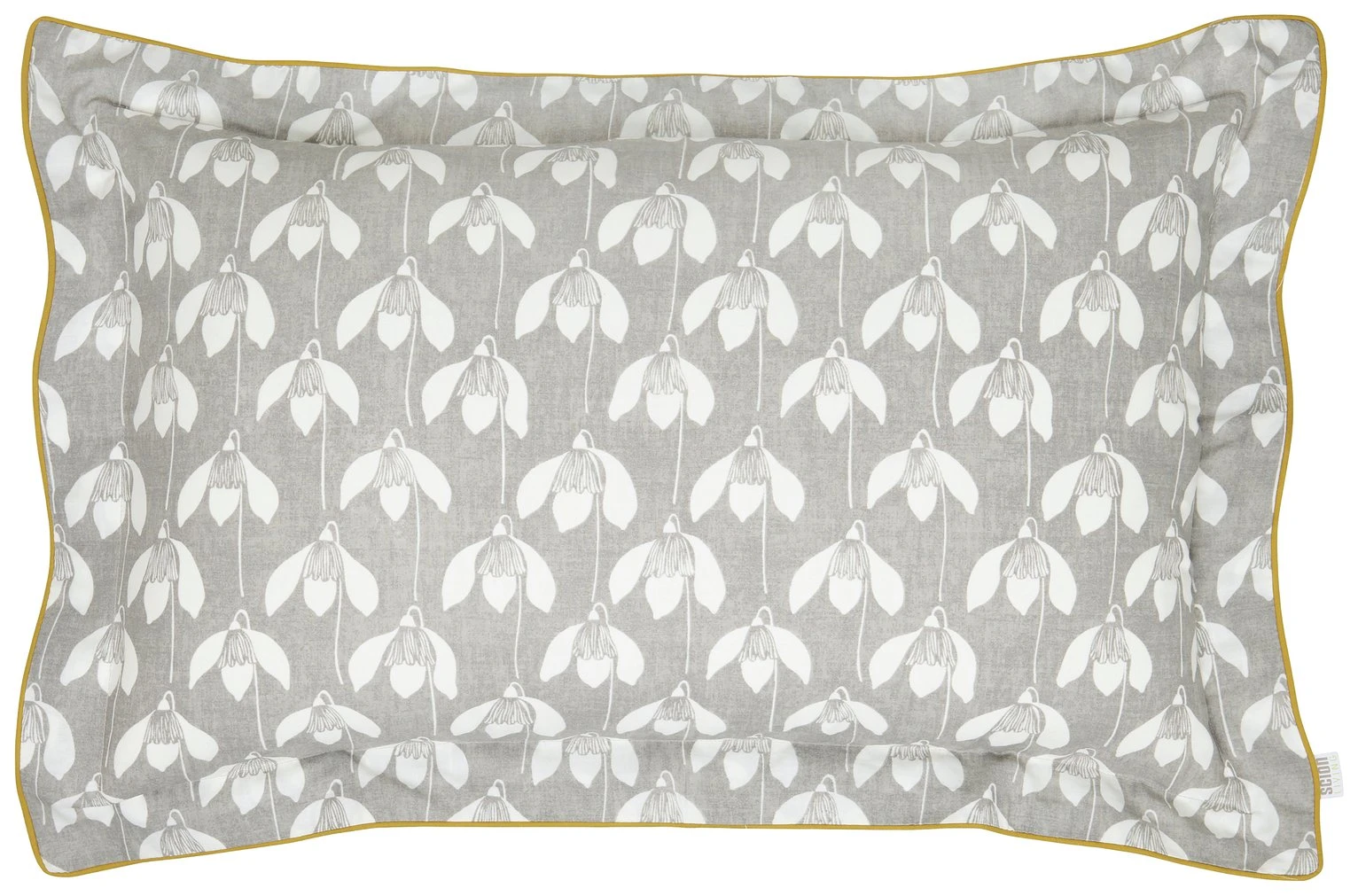 The Pillowcase features an all over stylised snowdrop flower head, pigment-printed on a grey ground, the design is reflected on the reverse in the contrasting colourway.