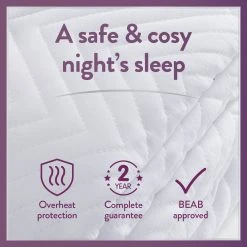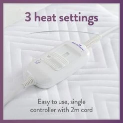 Quilted Comfort Layer, Single detachable control with 3 heat settings, 5 minutes heat-up time, Suitable for all night use, Low energy consumption 60Watt, Reinforced Elasticated Straps, 2 meter cable, Overheat Protection, BEAB Approved, 2 Year Guarantee, Machine Washable, 80x150cm – Single Bed.