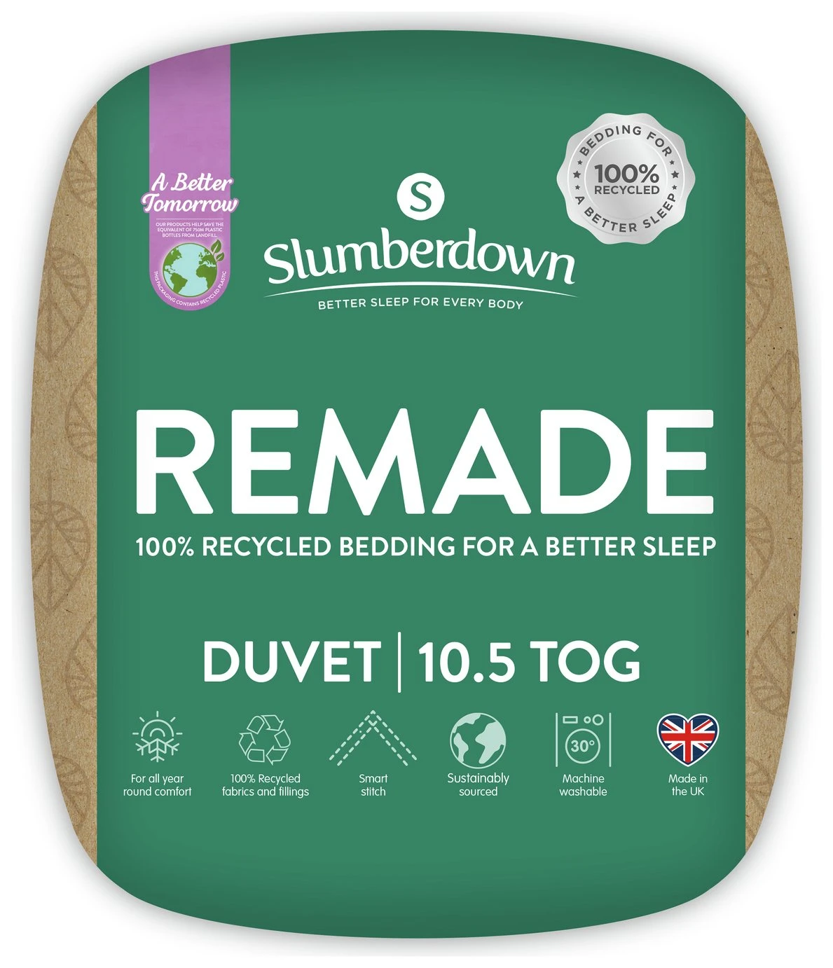 At Slumberdown, we believe everybody deserves a better night sleep. The Slumberdown Re-Made 10.5 Tog Duvet is made from 100% recycled materials. The duvet has been designed for all year-round use. The soft touch cover and recycled fibre provide the optimum level of warmth, ensuring have a great night's sleep. What's more the product is Easy Care which means it's machine washable and can be tumble dried.