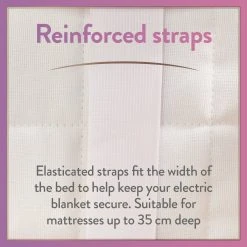 Single detachable control with 3 heat settings, 5 minutes heat-up time, Suitable for all night use, Low energy consumption 70Watt, Reinforced Elasticated Straps, 2Mtr Wire, Overheat Protection, BEAB Approved, 2 Year Guarantee, Machine Washable, 107x122cm – suitable for a Small Double/Double Bed.